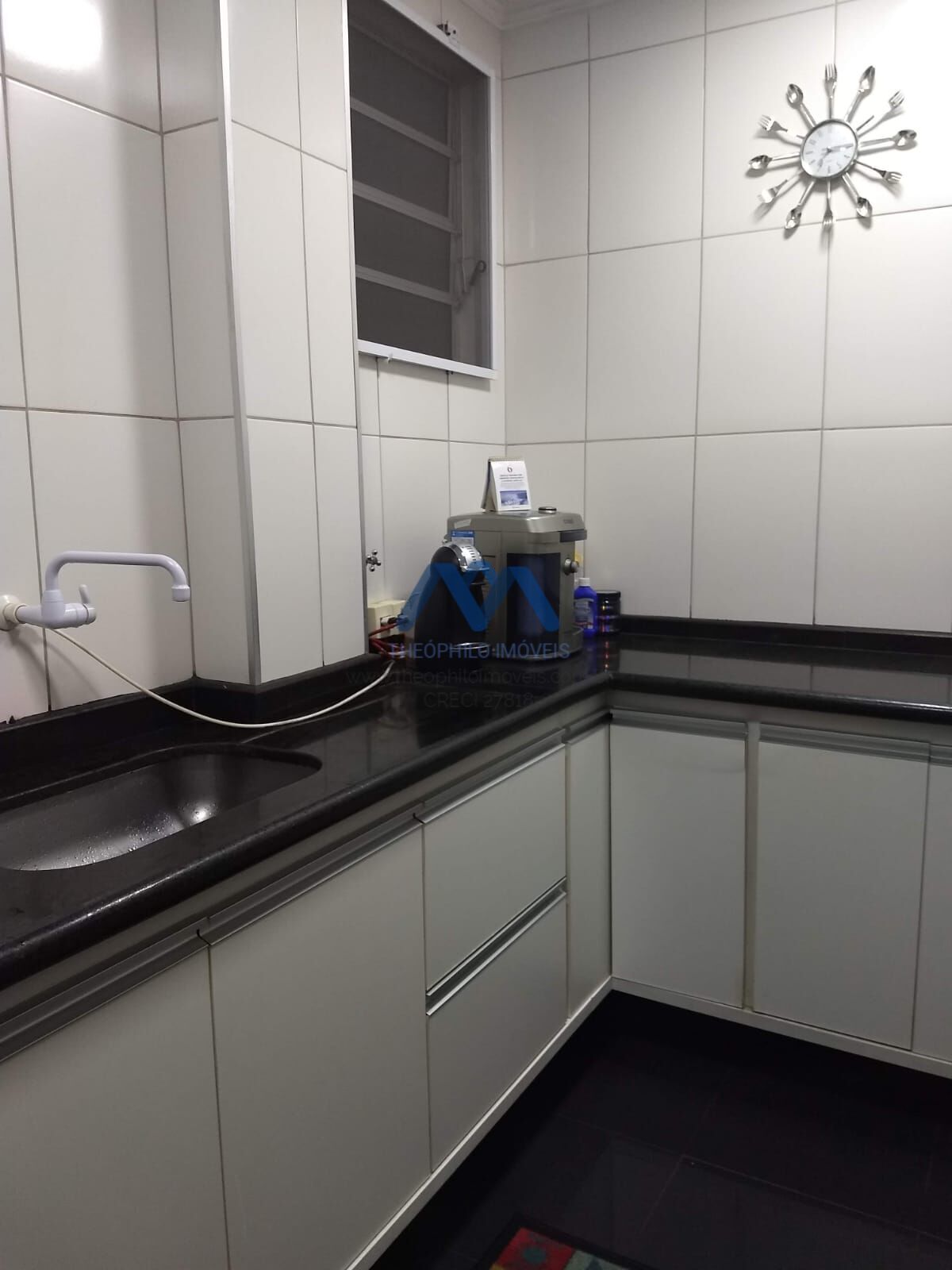 Cozinha com armários, cooktop, coifa e piso frio