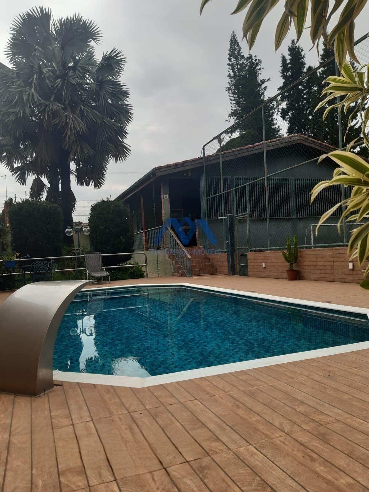 Piscina vinil com 6 x 4 com piso de pedra mineira e cascata em Inox, muro de pedra Canjiquinha.